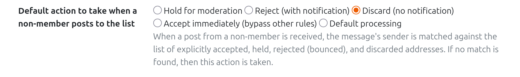 Hi, I am experiencing issues with one of the settings on our mailing list (dev@ml.whitebox.aero), hosted on your services. When I try to set this setting to anything else, it just reverts to "Discard": This is very disruptive for us, as we have threads that include non-members, and their emails are silently discarded - which is problematic and very confusing to everyone. Could you fix that? We need anyone to be able to write on the mailing-list, preferrably accepting them immediately rather than going through the moderation queue, which can take time to be processed. -- Xavier Whitebox.aero <https://whitebox.aero/>